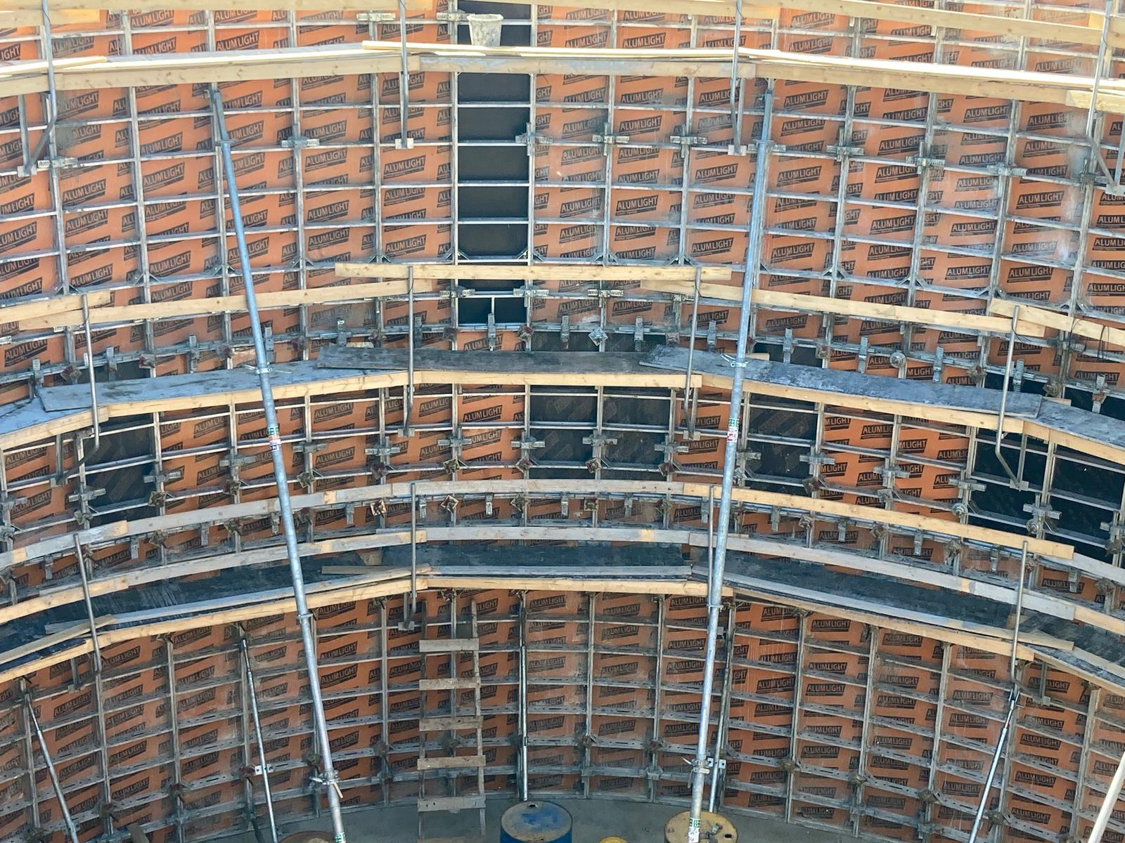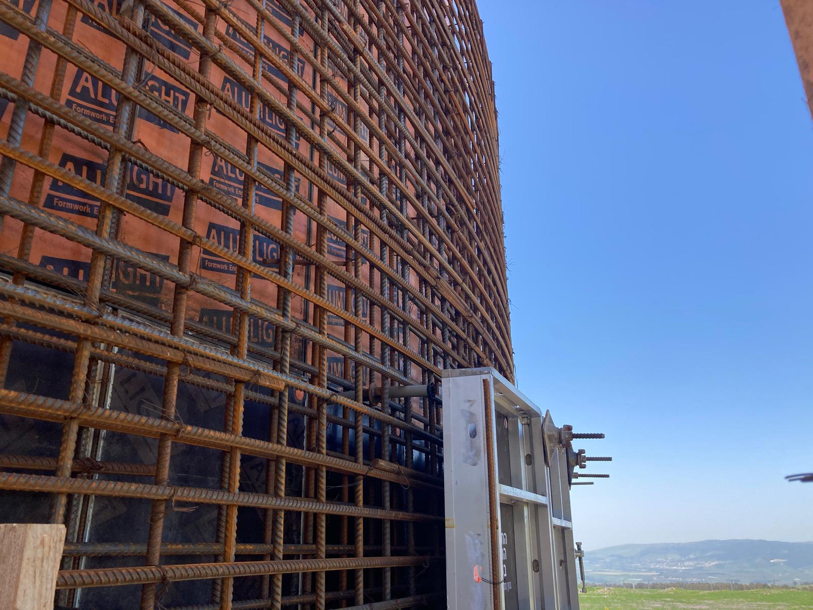 בפרויקט מאגר המים העגול באזור הדרום, התבקשנו לתכנן ולספק תבניות מודולריות ליציקות בטון למידות: 13.5 מ' גובה, קוטר פנימי 23.2 מ' ועובי קיר 35 ס"מ. חלק מהתכנון ההנדסי כלל סה"כ שמונה שלבי יציקה, ביניהם ארבעה תפרים אופקיים וארבעה אנכיים. במאגר יועמדו תבניות אלומיניום מודולריות +Rasta בגובה 3 מ' ו-1.5 מ', וכדי ליצור חפיפה, אותן תבניות יועלו ל- 6 מ' לשלב השני בגובה.
